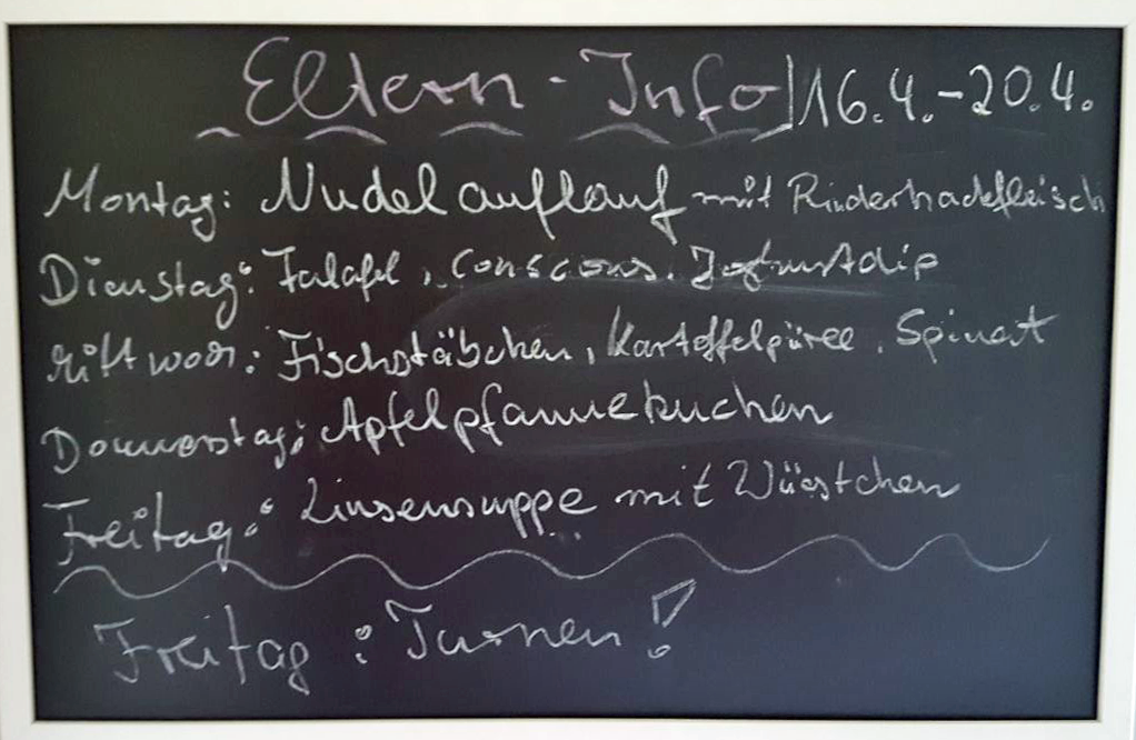 Ich werde jeden Tag eine ausgewogene Mahlzeit frisch zubereiten. Der Speiseplan wechselt wöchentlich. Ich biete außerdem regionale und saisonnale Gerichte an. Mir ist es wichtig, dass die Kinder neue Speisen kennenlernen.